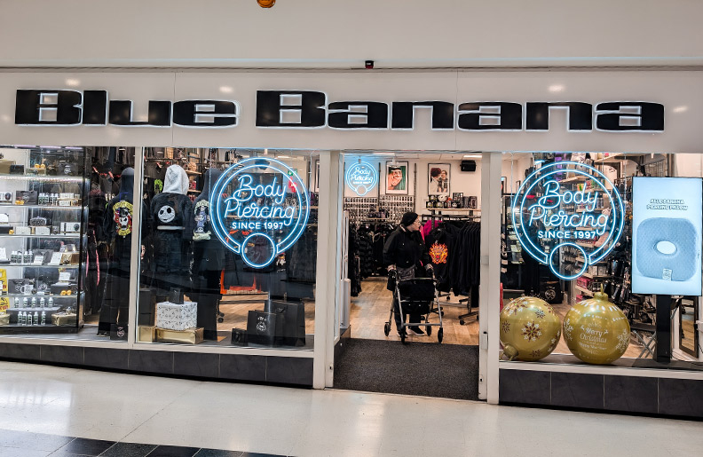Ist es Zeit für einen Einkaufsbummel und ein neues Piercing? Blue Banana Wolverhampton hat seine Türen weit geöffnet und ist randvoll mit alternativen Schätzen. Hol dir einen komplett neuen Look mit Kleidung, Schuhen, Accessoires, Haarfärbemitteln und mehr! Wenn du nach Piercinggeschäften in Wolverhampton suchst, wirst du unsere umfangreiche Auswahl an Piercingschmuck zu schätzen wissen, die zu unserem professionellen Piercingstudio passt. Durchsuche unsere Piercing-Informationsseiten nach den Preisen für Blue Banana-Piercings in Wolverhampton und finde hier auch unsere Ladenöffnungszeiten.